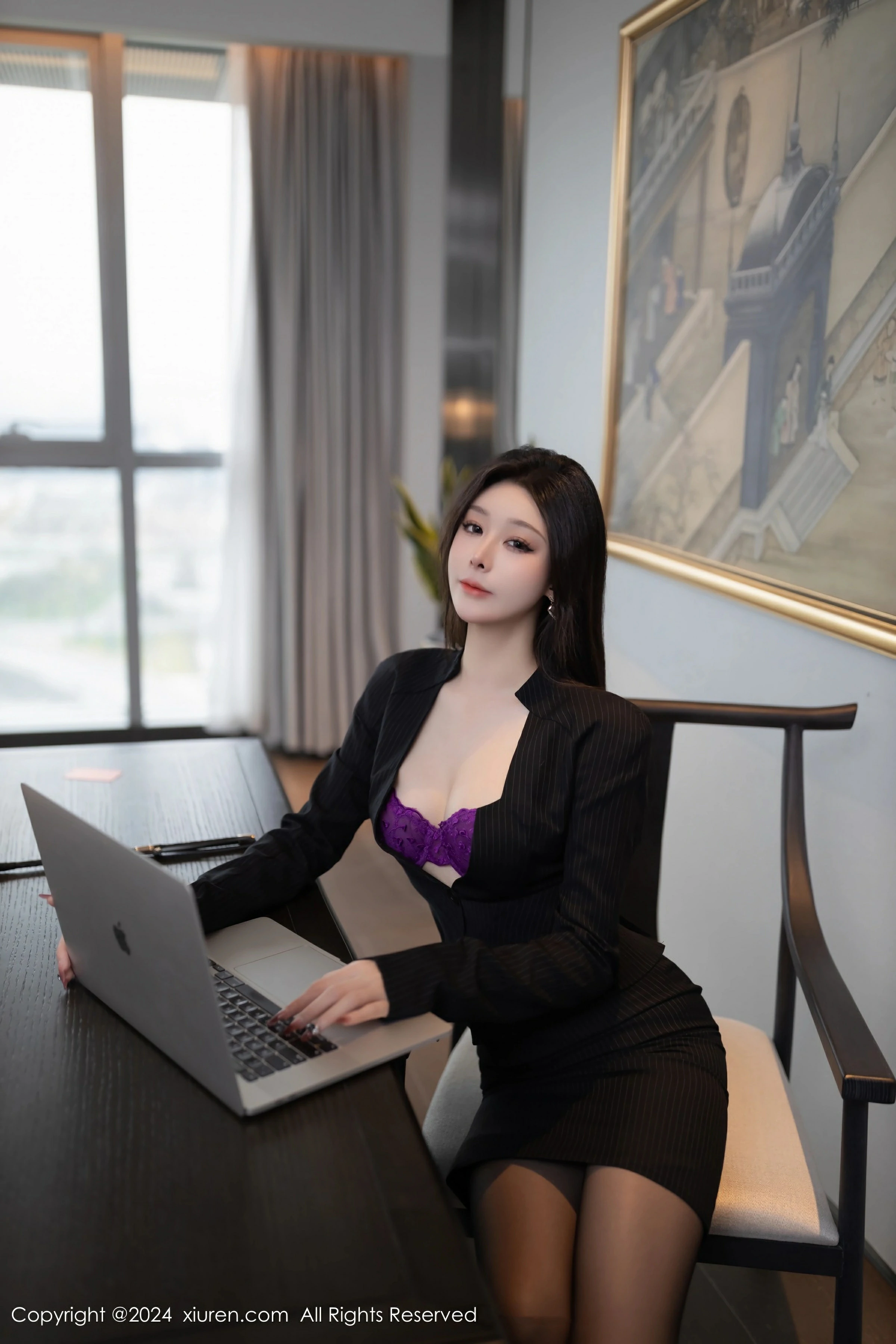 首先,让我们聚焦在她的服饰上。性感黑色秘书OL服饰是这次写真的亮点之一。黑色是一种神秘而独特的颜色,能够散发出难以抵挡的魅力。秘书服饰的设计极具吸引力,短款上衣展示出她的修长身材,同时露出迷人的锁骨和纤细的腰肢。紫色的内衣与黑色秘书OL服形成鲜明对比,增添了一丝神秘感。搭配黑丝袜,更加突出了她的美腿线条,勾勒出优美的弧度。整体造型简约大方,又不失性感妖娆。